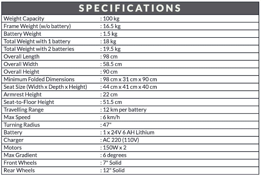Weighing just 16.5 kg without the battery, the JRWD704 is exceptionally lightweight and easy to transport. Its simple folding mechanism allows for quick and effortless folding and unfolding, making it ideal for those on the move. The Motorised Wheelchair comes with a quick-release 24V 6 AH lithium battery, offering a travel range of up to 12 km on a single charge. If you need to go further, you can add a second battery, doubling the travel distance to 24 km. Unlike many other models, when both batteries are installed, they work simultaneously to immediately extend your range.